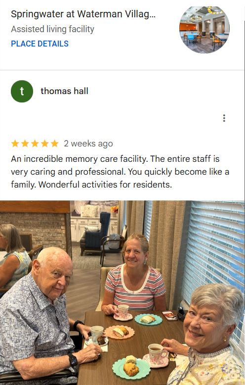 “There are many unique and special benefits of choosing a memory care residence that is part of a FULL service retirement village, rather than just a stand-alone memory care facility. Waterman Village has a church, dental offices, a dermatologist office, a physical therapy clinic, a nurse practitioner, physicians’ clinics, a home health care agency, and much more all on-site or just adjacent to it” *